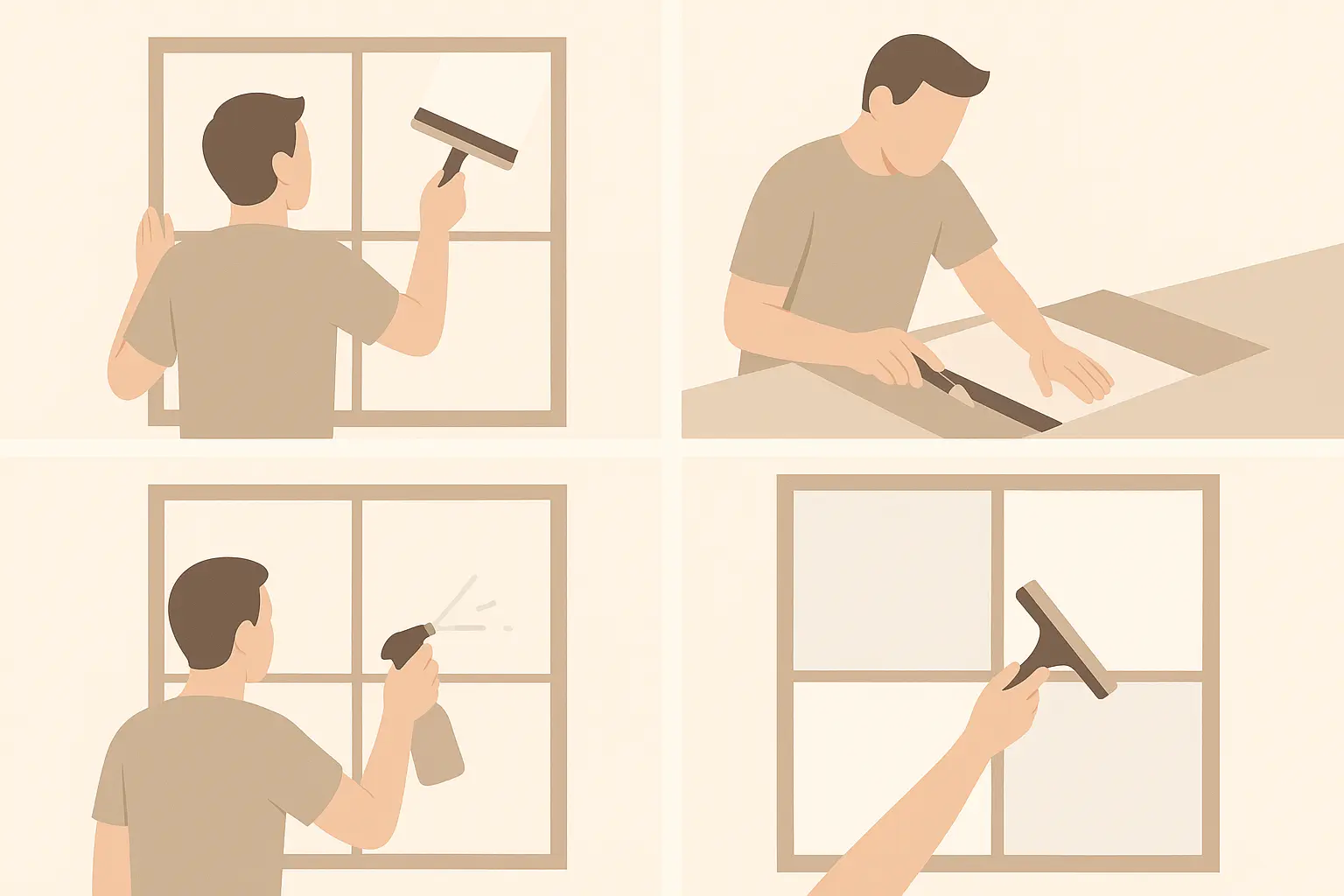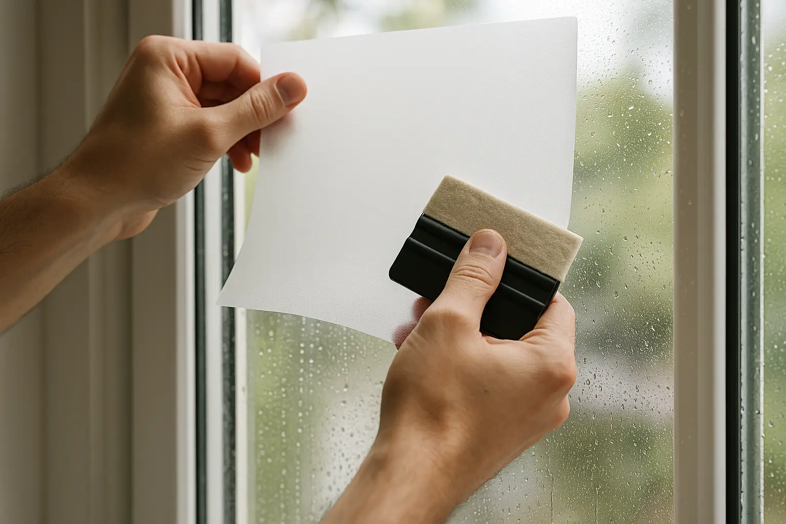 Mit dem richtigen Werkzeug, wie Rakel und Glasreiniger, gelingt das Anbringen von statischer Fensterfolie schnell und sauber – für dauerhaften Sichtschutz.